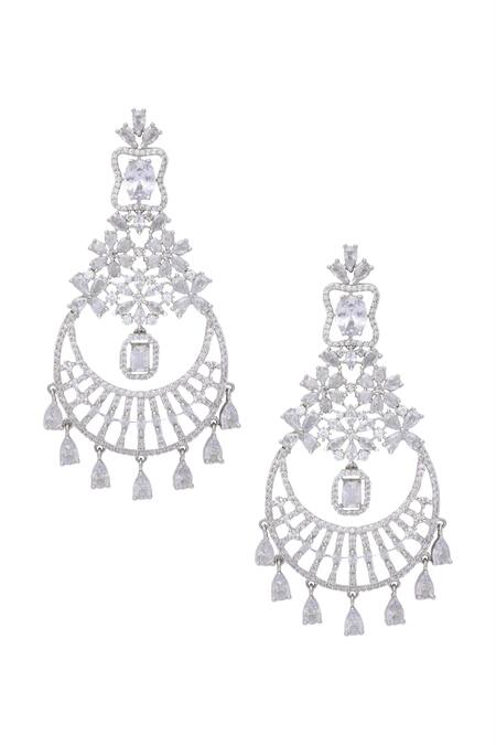 Crescent moon shape with floral cutwork, Embellished with moissanite and zircon stones, Intricate drop design with multiple layers