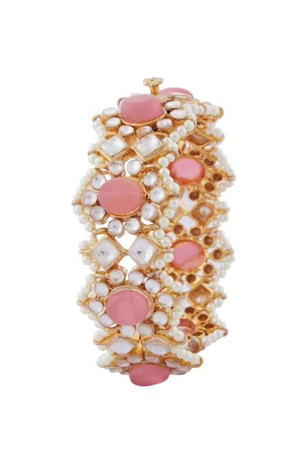 Gold-plated kada bangle featuring encrusted kundan and quartz stones with floral motifs and cutwork detail
