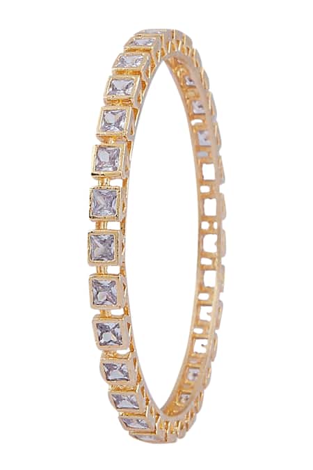 Gold plated bangles featuring crystal embellishments in a geometric design. This set includes four bangles made of a mixed metal alloy of brass and copper.