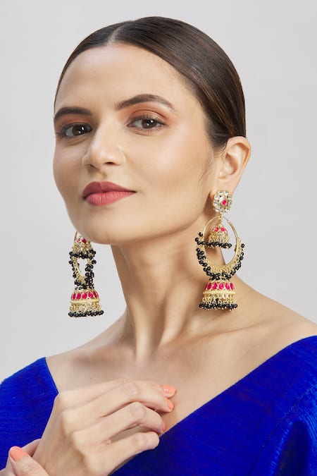 Black Beads, Stones, Zari, Gota Patti Gold Kundan Studded Floral Jhumkas