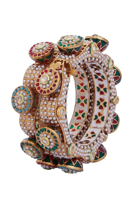 Gold plated bangle set featuring intricate meenakari artistry with semi-precious stones and pearl embellishments