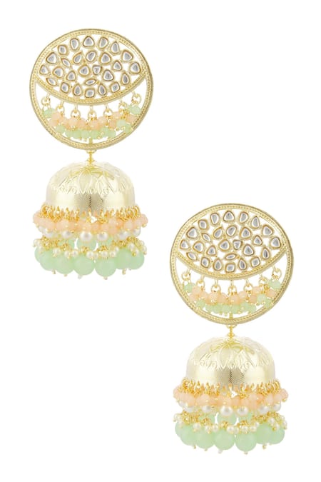Gold plated jhumkas featuring kundan work, adorned with light pink and green bead drops