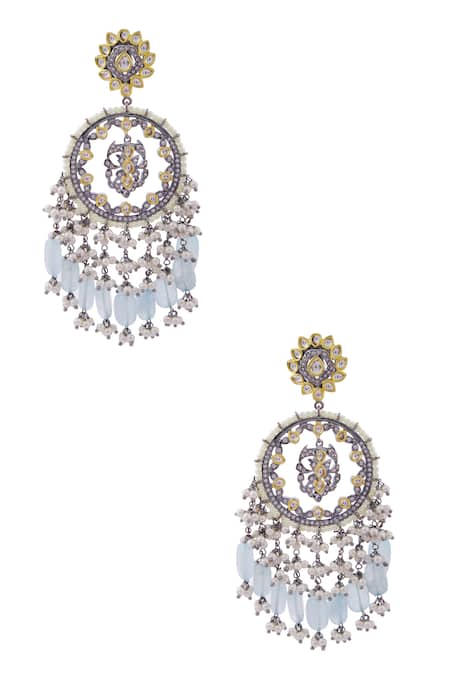 Floral motif top with intricate detailing, Tiered bead drops with pearl accents, Kundan and faux diamond embellishments