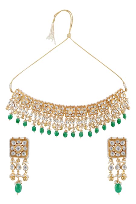 Gold choker necklace featuring intricate kundan, pearl, and stone work with green danglings. Paired with matching dangler earrings adorned with similar embellishments.