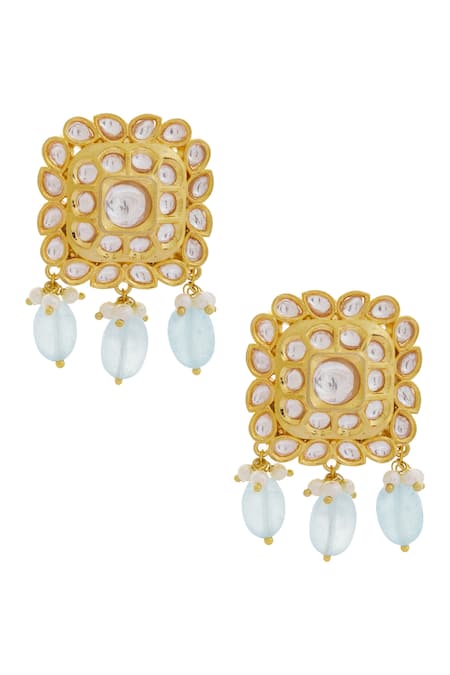 Gold-plated geometric choker featuring encrusted kundan and blue bead drops. Paired with floral stud earrings adorned with bead drops.