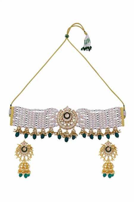 Gold-plated choker featuring encrusted pachi kundan, a crescent moon motif pendant, and multi-pearl strings. Paired with emerald stone drop jhumkas and floral top earrings with cluster bead drops.