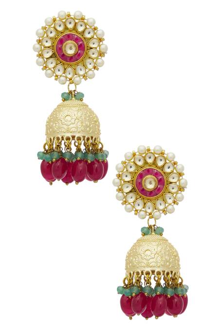 Gold Plated Stones, Beads, Rhinestones Kundan Floral Jhumkas