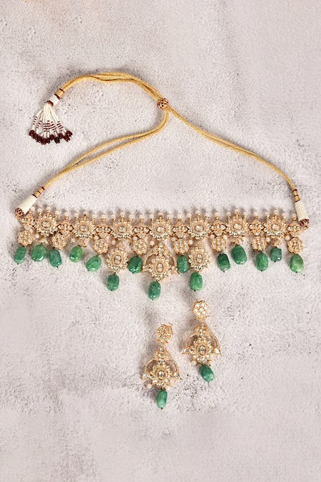 Gold choker featuring intricate kundan embellishments with emerald bead drops. Paired with matching dangler earrings adorned with similar details.
