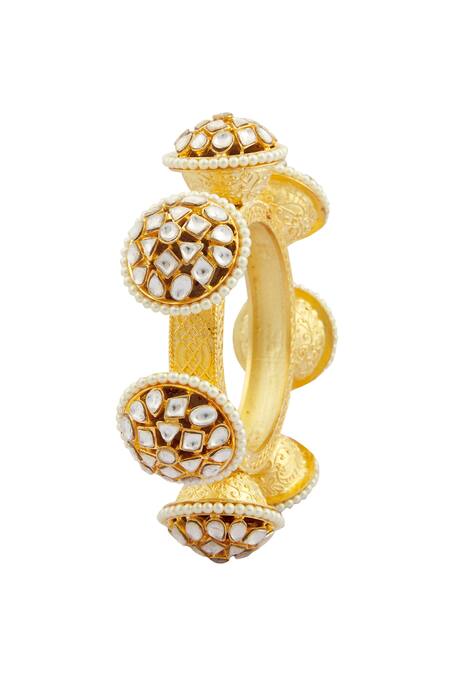 Gold-plated openable kada- bangle with encrusted kundan, carved texture & 3D motifs.