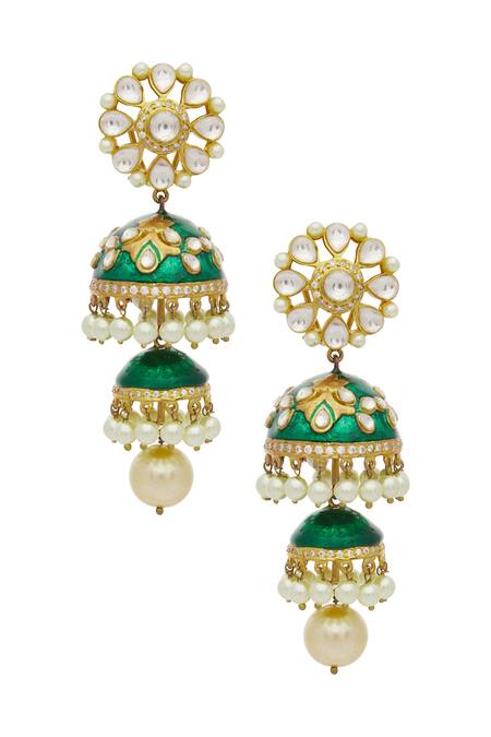 Floral motif top with pearl embellishments, Green meenakari detailing, Layered jhumka design