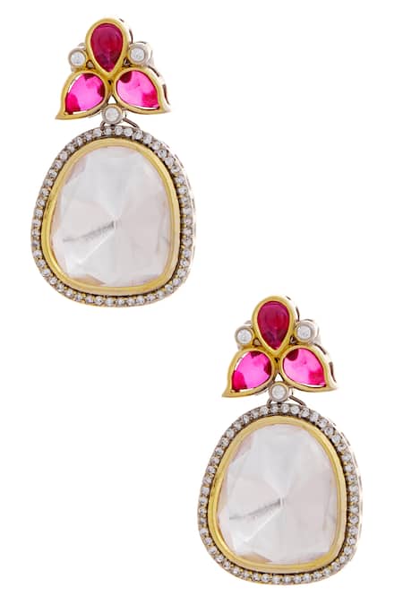 Gold-tone necklace featuring encrusted kundan and faux diamonds. Paired with floral top earrings with push back clasps.