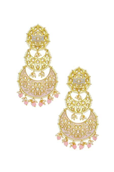 Gold-plated tiered chandbalis featuring encrusted kundan and pearl drops