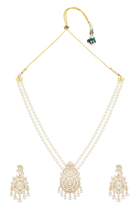 Gold polished pendant necklace featuring moissanite embellishments and doublet pearl strings. Paired with matching earrings adorned with intricate motifs and drop details.