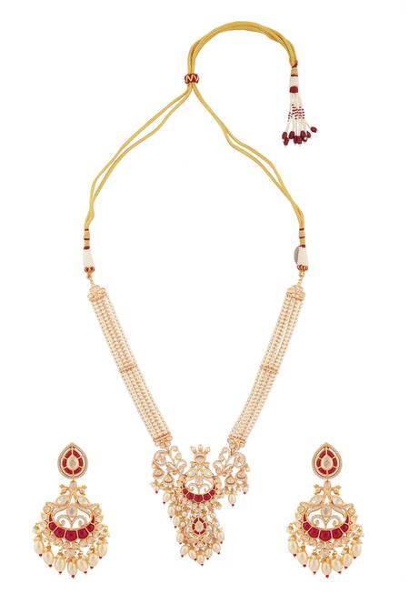 Moissanite ruby stones encrusted detailing, Gold Mor design with pearl embellishments, Long necklace with intricate design