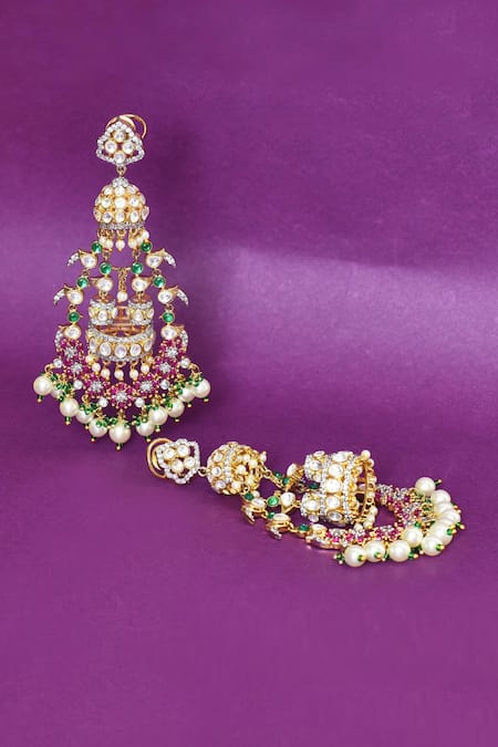 Pearl drops at the bottom, Kundan embellishments on top, Vibrant pink and green stones