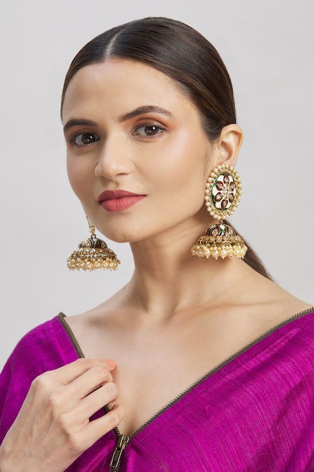 Gold jhumkas featuring round tops with meenakari work in dark green and maroon