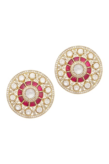 Gold polish geometric cutwork studs featuring ruby stones, polki, and zircon embellishments