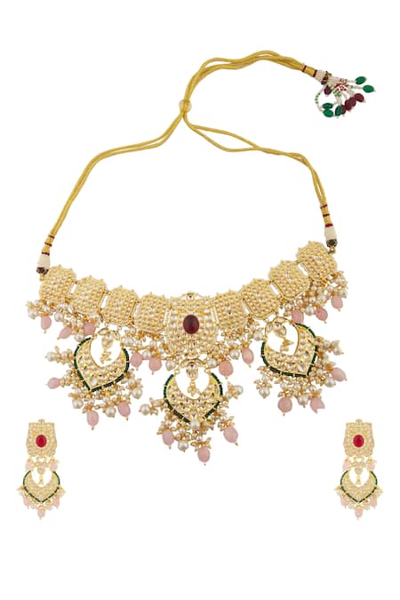 Gold necklace featuring ruby stones, moissanite, pearl trinkets, and green-pink bead embellishments. Paired with a matching pair of dangler earrings.