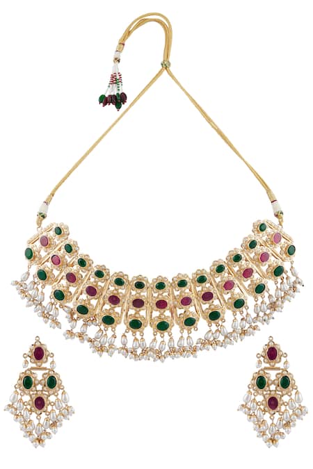 Gold plated choker featuring embellished semi-precious stones and bead drop details. Paired with matching earrings adorned with similar embellishments.