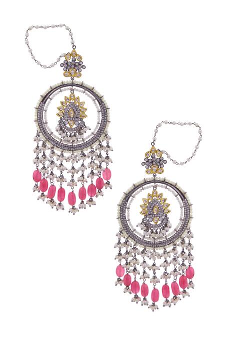 Silver-tone chandbalis featuring encrusted Victorian faux diamonds and hot pink stone danglings