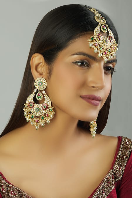 Gold plated maangtikka featuring embellished beads and semi-precious stones. Paired with chandbalis adorned with pearls and intricate crescent carvings.