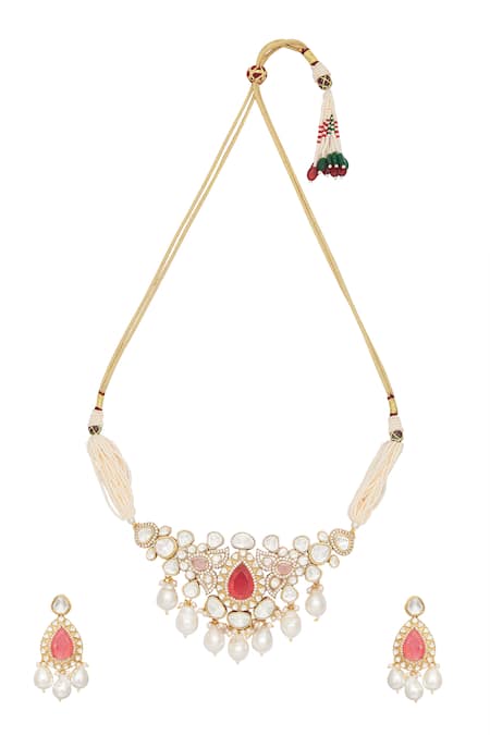 Gold polished choker necklace featuring ruby, pink doublet kundan, polki embellishment & bead drops. Paired with matching earrings adorned with similar embellishments and pearl drops.