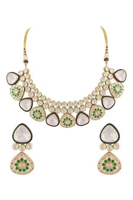 Emerald stones set in a floral pattern, Kundan work with a glistening finish, Meenakari detailing enhancing the overall design