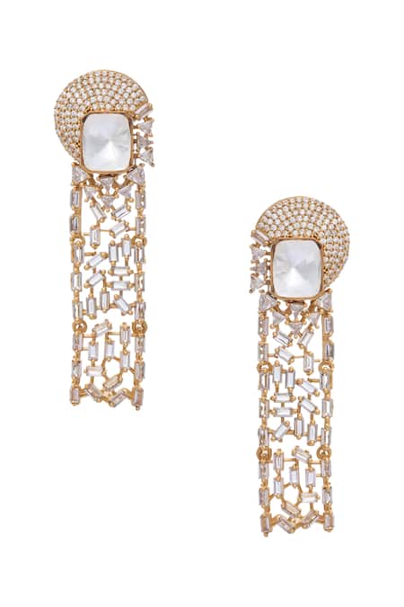 Intricate gold plated design with a mix of zircon and moissanite stones., Unique drop style with a geometric pattern., Push back closure for secure fit.