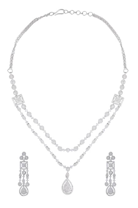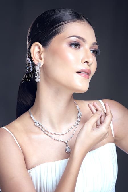 White plated teardrop pendant, Layered necklace with zircon highlights, Matching earrings with intricate design