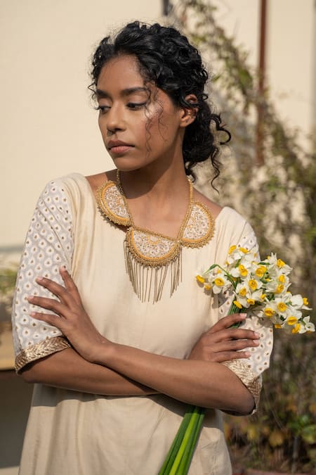 Beige Beads Handcrafted Embroidered Necklace