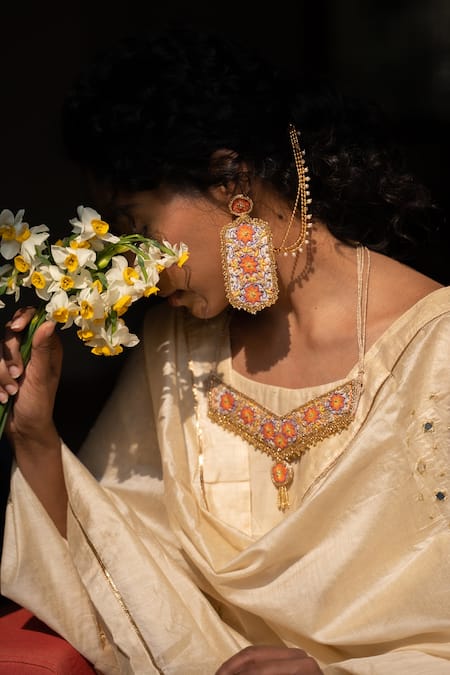 Floral embroidered motifs, French knot gold zari, Chain detail