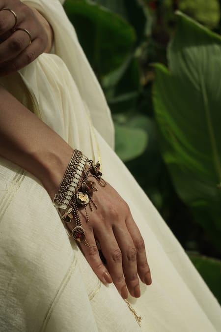 Multicolor bracelet featuring intricate gold zari handwork with floral tassels