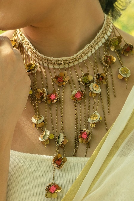 Multicolor choker featuring handwork of gold zari with bright floral tassels