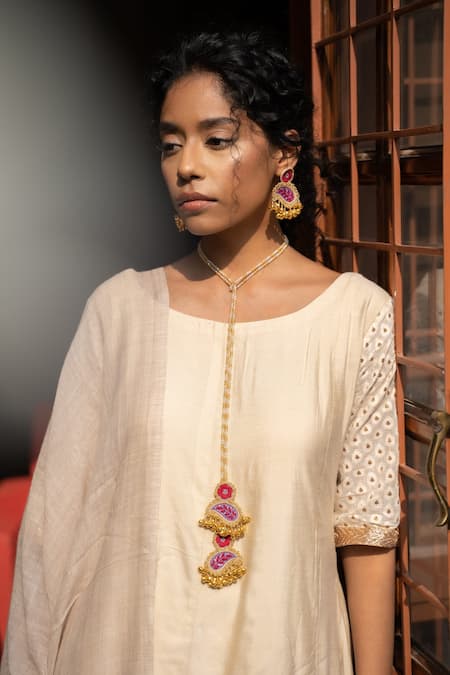 Maroon, purple, and gold paisley-shaped pendant necklace featuring floral embroidered motifs and ghungroo drops