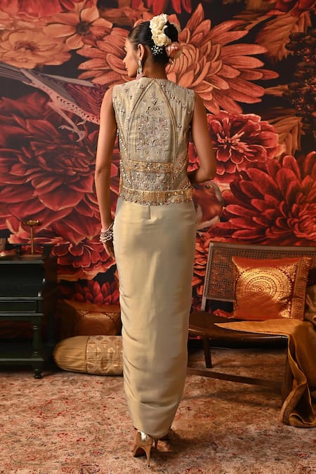 Pista green double-layered asymmetric jacket with bead embellishments and foil print. Paired with a plain waistcoat style bustier and draped dhoti style skirt.