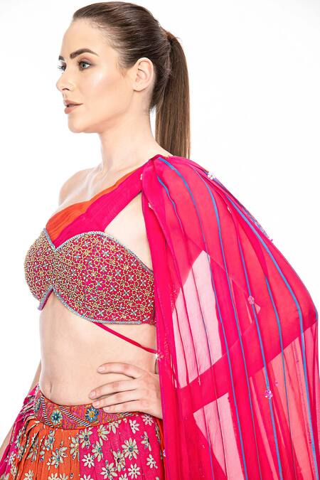 Pink & orange pleated lehenga with floral embellished motifs. Paired with bustier style blouse with attached draped pallu.