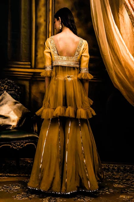 Olive green asymmetrical kurta with embellished bodice, mesh hemline and ruffle trims. Comes with sharara pants.