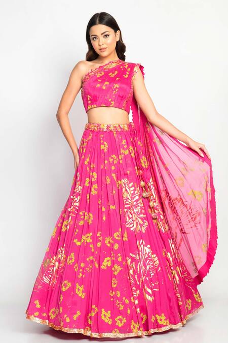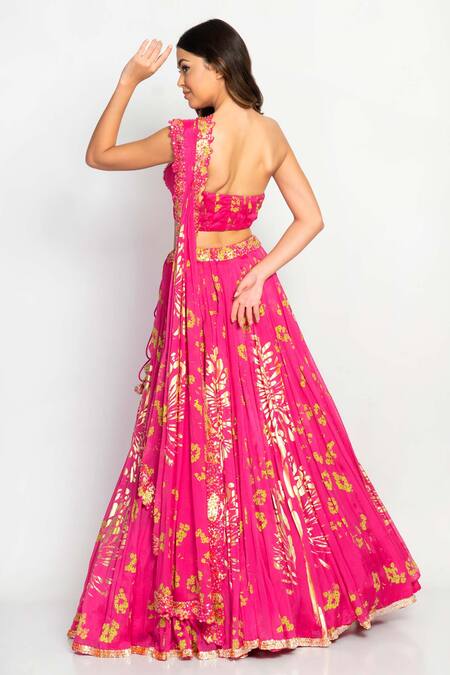 Fuchsia lehenga with attached cancan & floral print. Paired with one shoulder padded blouse & attached dupatta.