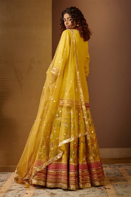 Amber yellow short hem kurta with embellished yoke & hem. Paired with floral motif printed sharara & sheer dupatta.