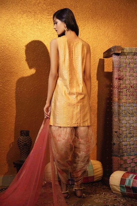 Buy_Moledro_Yellow Silk Chanderi And Lurex Tulle Foil Print Round Kurta & Dhoti Pant Set _Online_at_Aza_Fashions