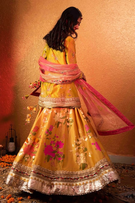 Amber yellow lehenga with floral printed motifs, sequin work and gota patti trims. Comes with a blouse, overlapping style kurta and dupatta.