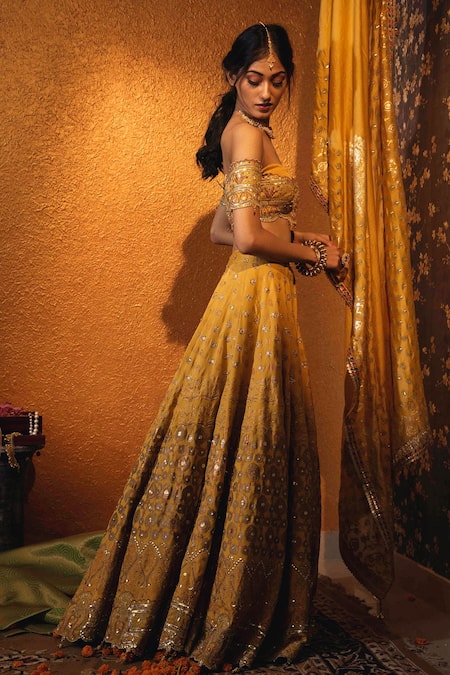Amber yellow lehenga with printed motifs and embellishment. Comes with off shoulder blouse and dupatta.