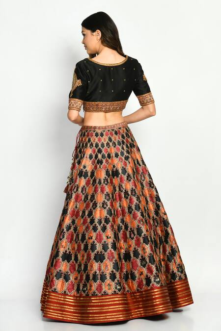 Multicolored dupion lehenga with antique jharokha motifs. Paired with embroidered blouse & dupatta.