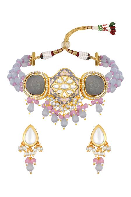 Gold embellished necklace featuring kundan polki, agates, and monalisa beads. Paired with matching earrings adorned with similar embellishments.