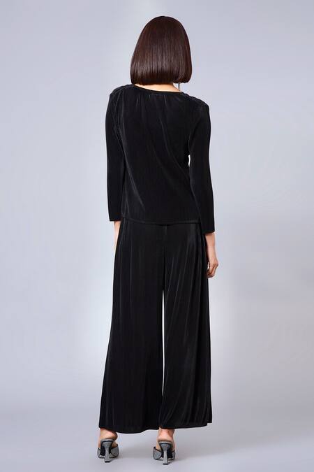 Black pant in luxe pleated base fabric with soft gloss. Paired with co-ordinating top with twisted knot detail.