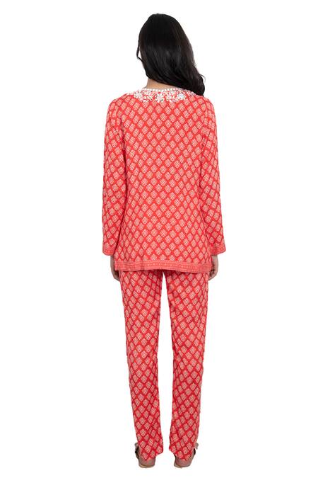 Red floral print short kurta with mirror embroidery front placket. Paired with printed pant.