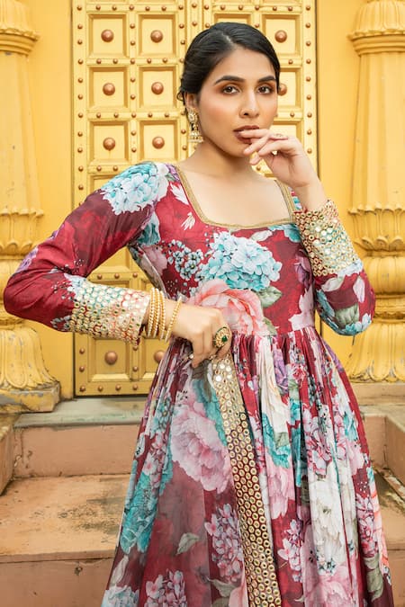 Maroon anarkali featuring floral print, mirror borders, and lace detail on the neckline. Paired with a matching dupatta.