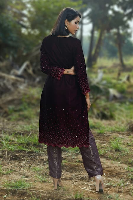 Wine kurta in velvet featuring sequin embroidery and a geometric pattern. Paired with shimmer georgette pants with a scallop hem.