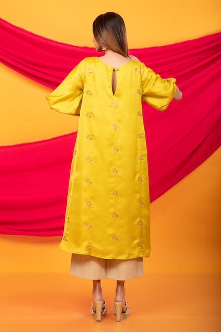 Canary yellow A-line kurta featuring puffed sleeves and floral buttis embellished with threads and sequins. Paired with golden pant and attached lining for added comfort.