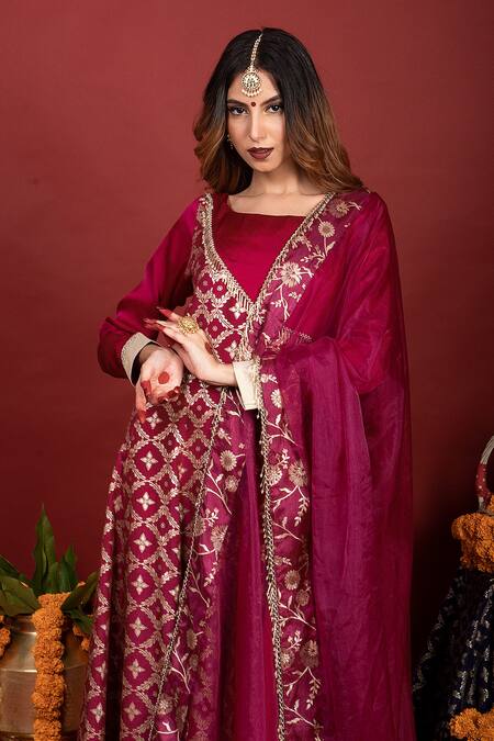 Purple floral patterned Anarkali featuring a square neckline and full sleeves. Paired with an organza dupatta with tassel detailing.